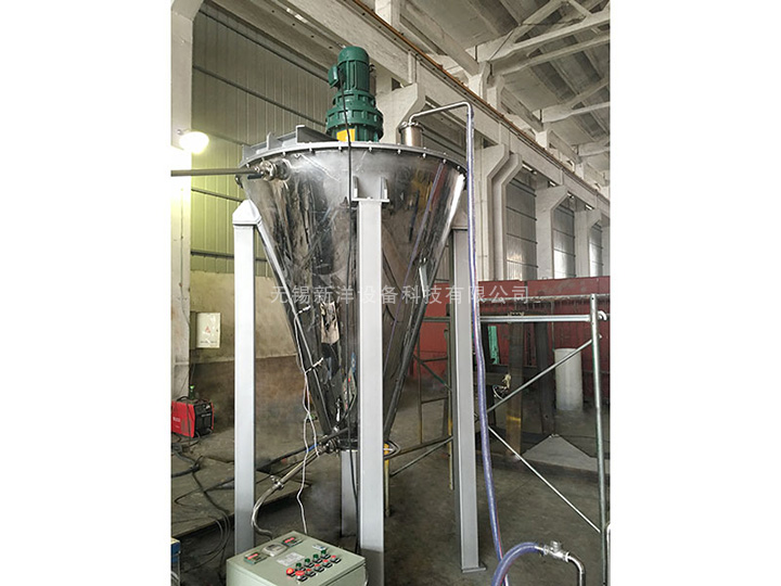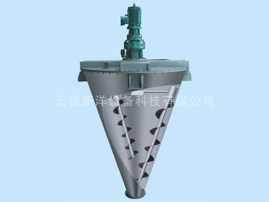 立式混合機,它由傳動部分、筒蓋、螺旋、筒體、出料閥等組成。