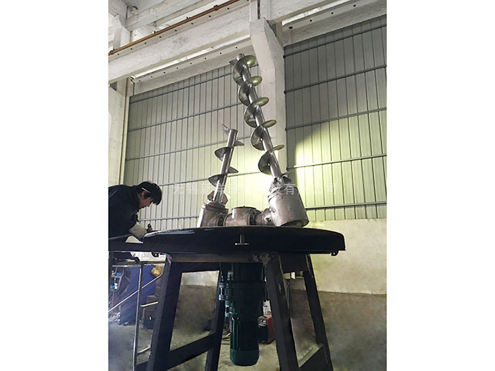 3、螺旋部分:筒體內兩只非對稱排列的螺旋作自、公轉行星運動時,在較大范圍翻動物料,使物料快速達到均勻混合。